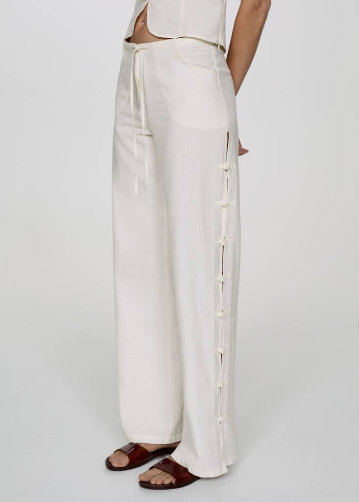 Cotton and linen blend fabric. Long design. Wide-leg design. Low waist. Two front pockets. Invisible front zip fastening. Side slits. Decorative buttons. Total look