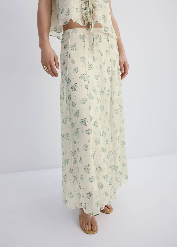 Coupe évasée. Coupe midi. Imprimé fleuri. Taille mi-haute. Détail godets. Fermeture Éclair sur le côté. Doublure intérieure