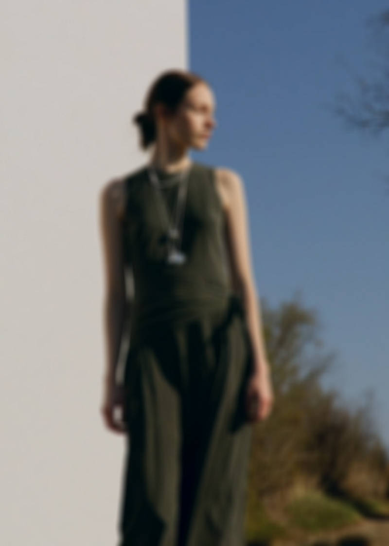 Tissu mélange Lyocell. Coupe midi. Design évasé. Col rond. Sans manches. Bretelle large. Détail de foulard à la taille. Fermeture éclair latérale. Disponible en grande taille