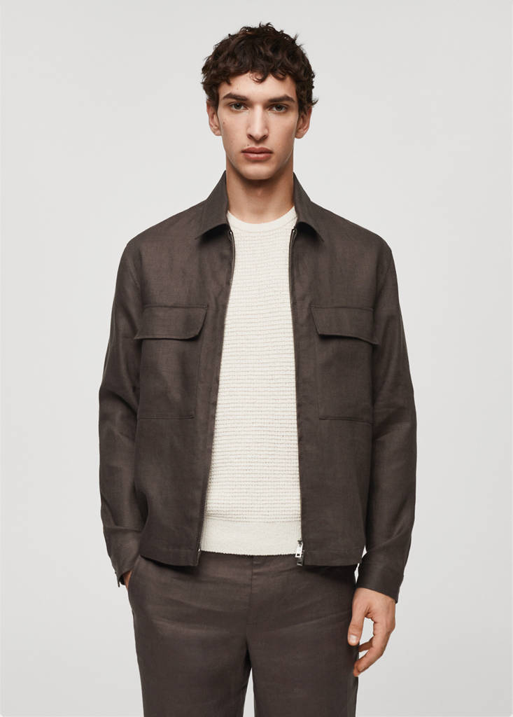 La couleur marron est exclusive en ligne. Tissu 100 % lin. Fermeture Éclair à l’avant. Deux poches à rabat à l’avant. Manches longues et poignets boutonnés. Ourlet droit. Col classique