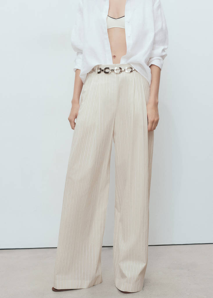 100% قطن. تصميم طويل. تصميم واسع الساق. تصميم مخطط. خصر متوسط. حلقات حزام. تفاصيل طيات أمامية. جيبان جانبيان. جيبان برباط في الخلف. إبزيم بخطاف وسحاب