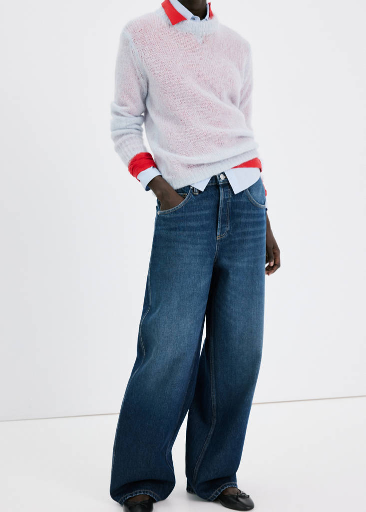 قماش قطني بأسلوب جينز. تصميم بالون. خصر متوسط. حلقات حزام. خمسة جيوب. زر وسحاب للإغلاق