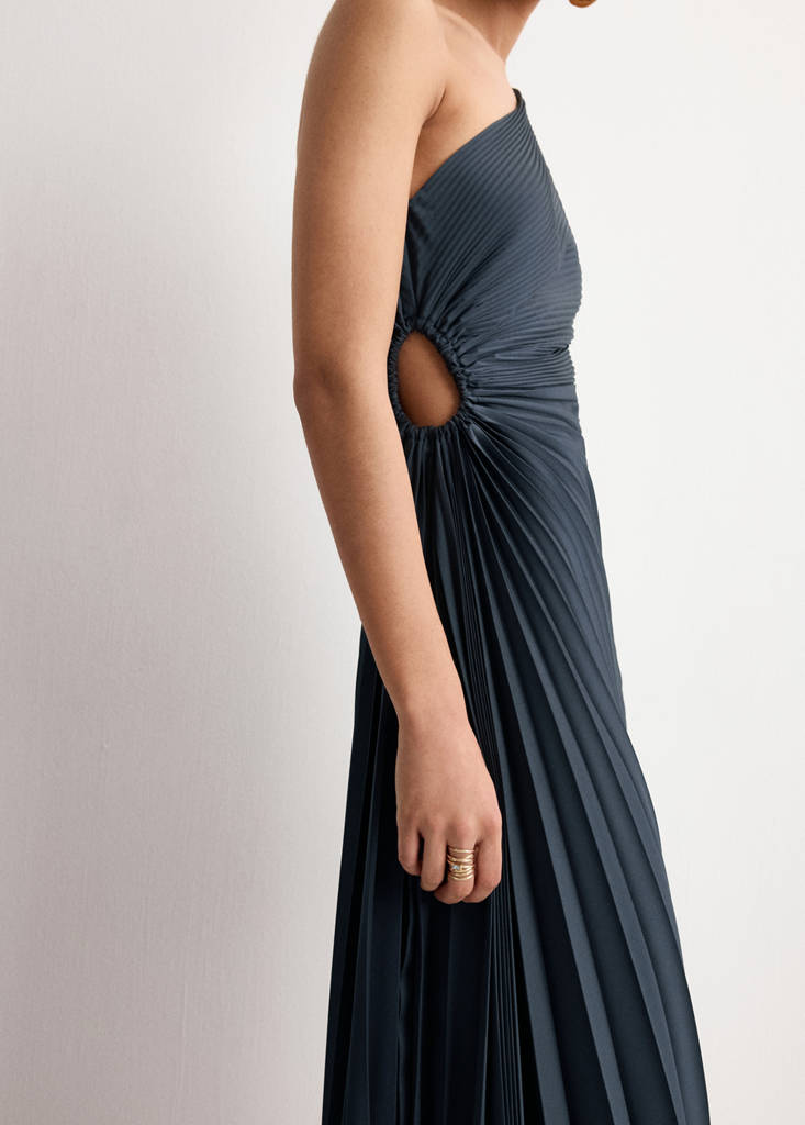 نسيج بطيات. تصميم طويل. ياقة غير متماثلة. حزام عريض. الشق الجانبي. حافة غير متناظرة. إغلاق بسحاب جانبي. بطانة داخلية. هذه القطعة تنتمي إلى مجموعتنا للحفلات والمناسبات، مصممة لرفع مستوى إطلالاتك في المناسبات الخاصة