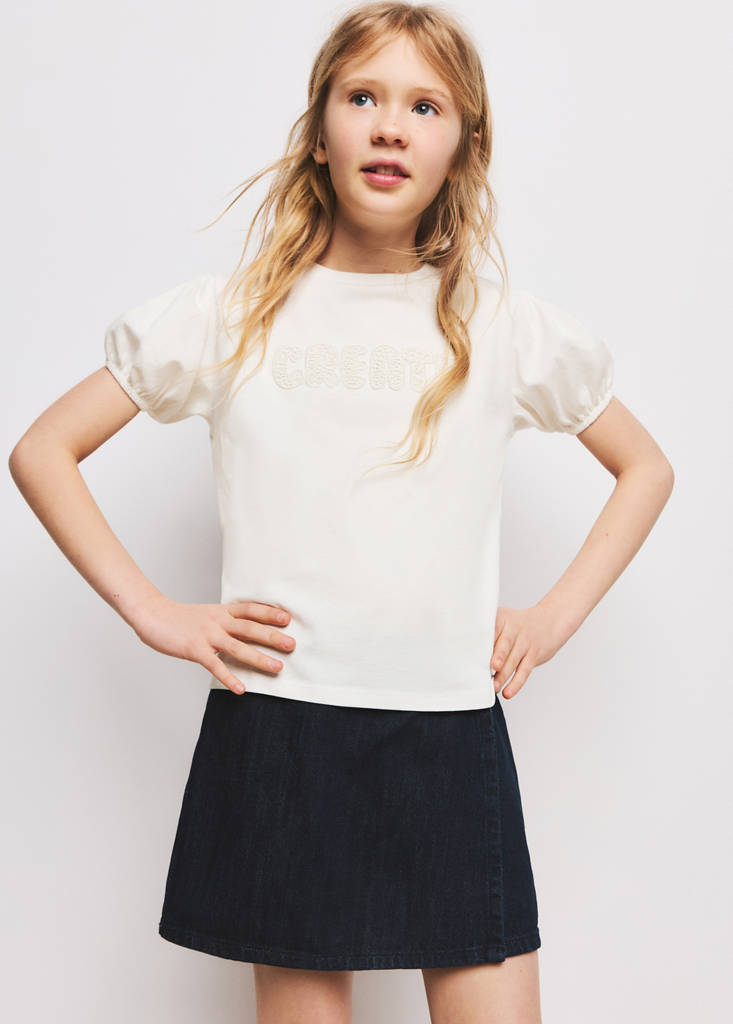 نسيج 100% قطن. تصميم مستقيم. ياقة دائرية. أكمام قصيرة. أكمام منفوخة. نص مطرز