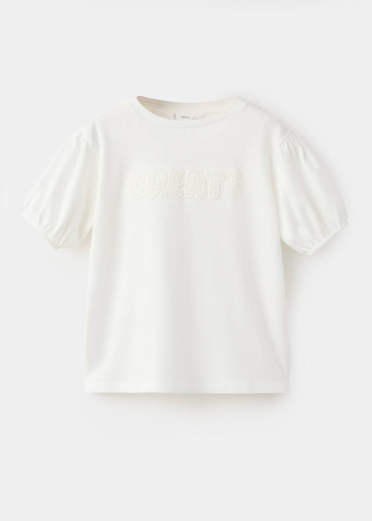 100% cotton fabric. Straight design. Round neck. Short sleeves. Puffed sleeves. Embroidered text