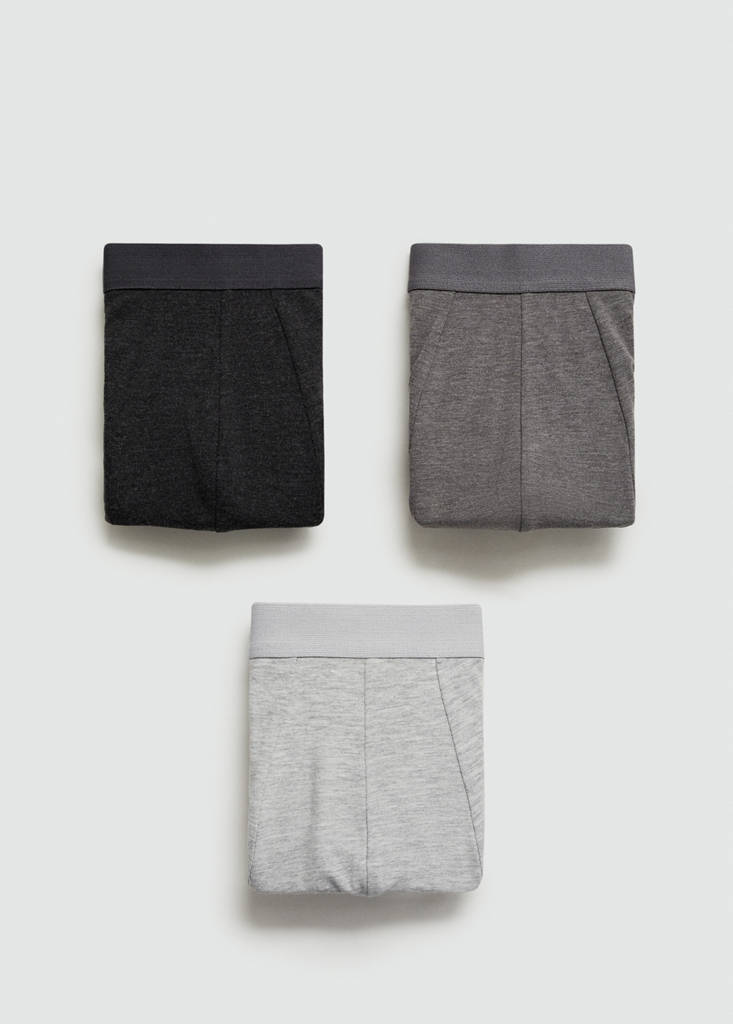 3-pack cotton boxersCurrent price [SAR 159.00 ]SAR 159.00Select a colourGreySelect your sizeSNot available. I want it!MNot available. I want it!LNot available. I want it!XLNot available. I want it!DimensionsNotify meAdd to WishlistSee lookConvenient home deliveryPack of 3. Stretch cotton fabric. Three different shades of grey. Boxer type. Elasticated waistbandDetails, composition and careStore availability