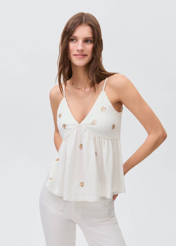 Sequin embroidery topCurrent price [SAR 159.00 ]SAR 159.00Select a colourOff WhiteSmall garment - Choose one size up from the usualSelect your sizeXXSNot available. I want it!XSNot available. I want it!SNot available. I want it!MNot available. I want it!LNot available. I want it!Notify meAdd to WishlistSee lookConvenient home delivery100% cotton fabric. Embroidered design. Embroidered with sequins. V-neckline. Thin straps. Ruched detail at the frontDetails, composition and careStore availability