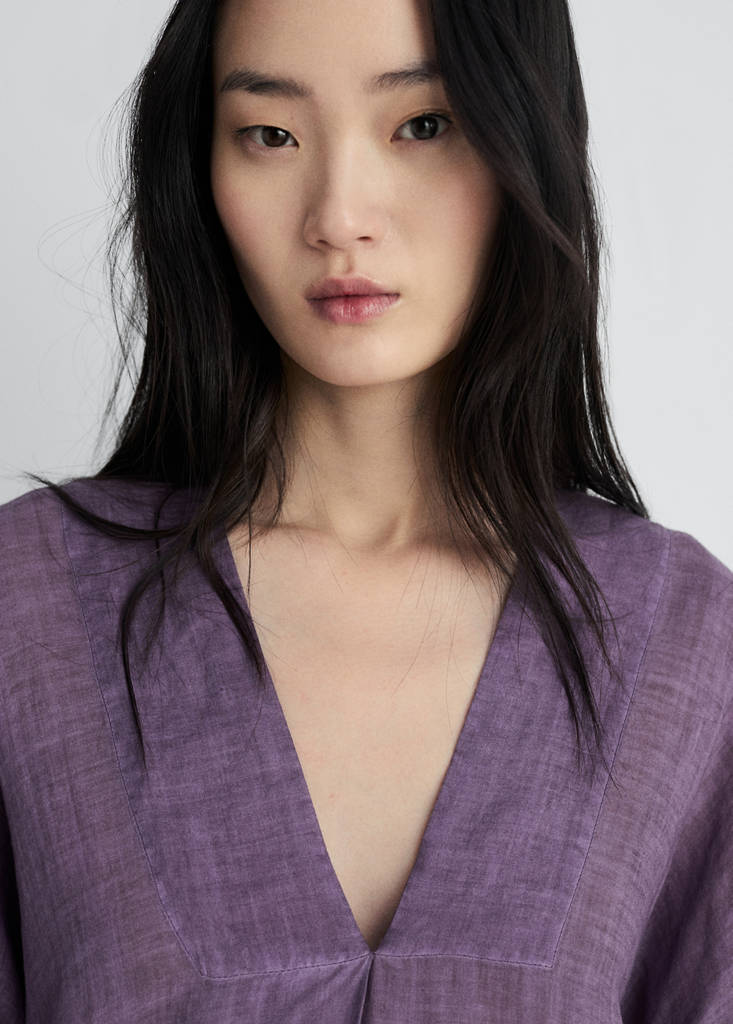 100% ramie. V-neck. Long sleeves. Midi design. Flared sleeves. Provides comfort and freedom of movement. Available in different colours