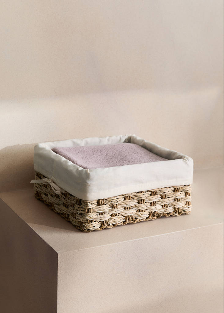 100% seagrass. Size: 34x34x12 cm. With inner fabric. Simple and functional design storage basket, ideal for any space. Available in two sizes