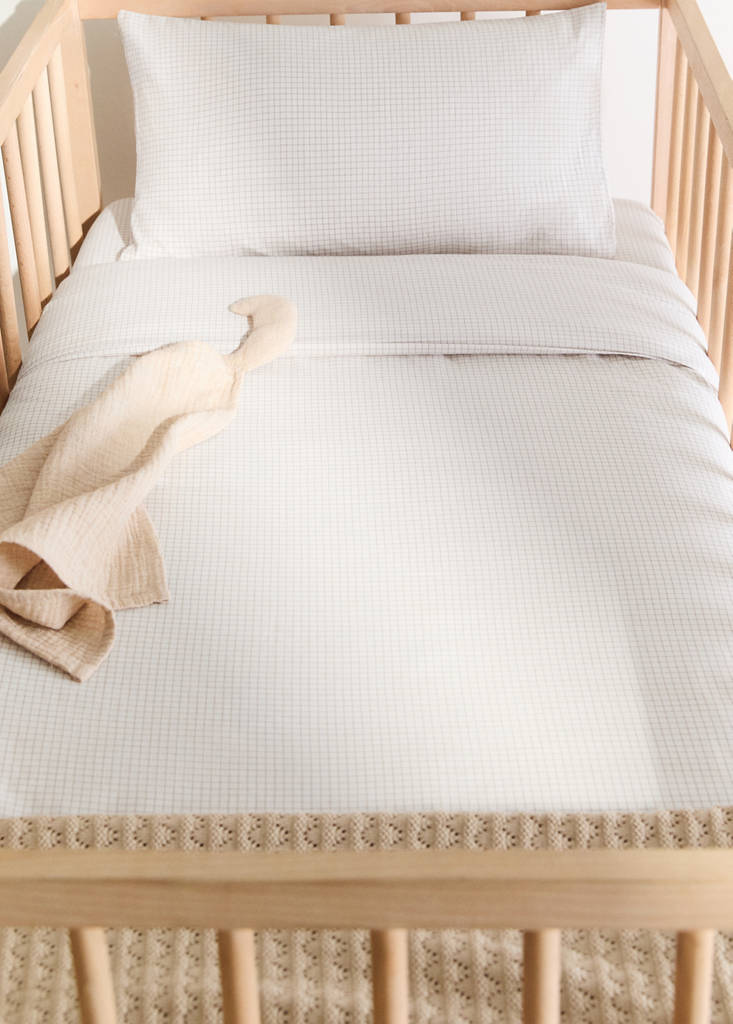 Size: 100x120 cm. 100% Cotton. 200 thread count. Made in Portugal. This cot duvet cover is made from high-quality percale cotton, known for its softness, breathability and durability. It features a yarn-dyed design with a mini-check pattern, giving it an elegant and timeless aesthetic, ideal for any child's room. Combine it with more products from the collection
