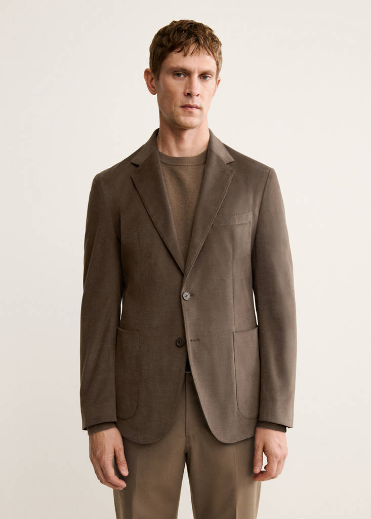 Cotton-viscose blend fabric. Notched lapel collar. Double button fastening. Chest welt pocket. Two patch pockets at the front. Inside welt pocket. Long sleeves with buttoned cuffs