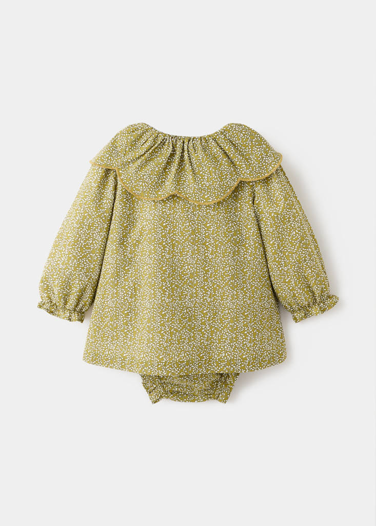 100% cotton fabric. Floral-print design. Babydoll collar. Long sleeves with ribbed trims. Front closure with buttons. Printed cotton nappy cover. Christmas Collection