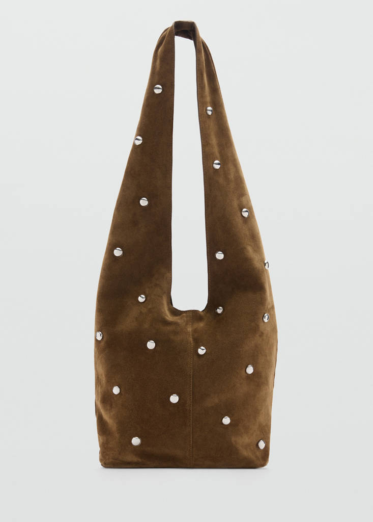 Large. Suede. 100% bovine leather. Tote design. Shoulder strap. Long strap. Inside bag. Zip fastening. Inside magnet fastening. Decorative studs. Inner lining