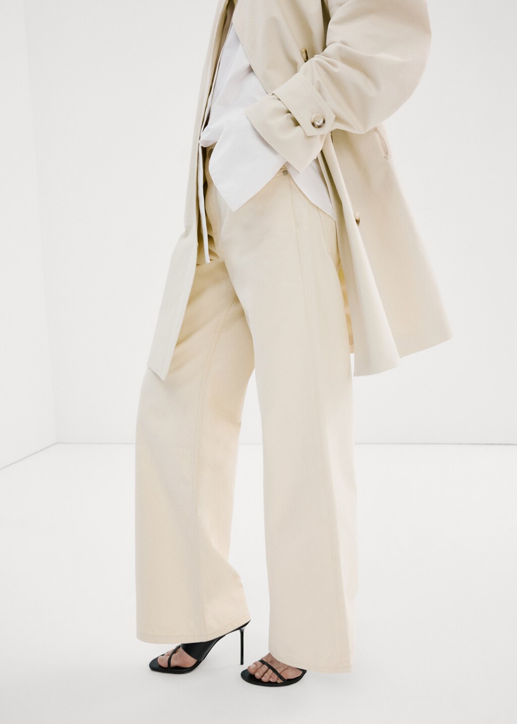 Denim-style cotton fabric. Wide-leg design. Long design. Low waist. Belt loops. Five pockets. Button and zip fastening.