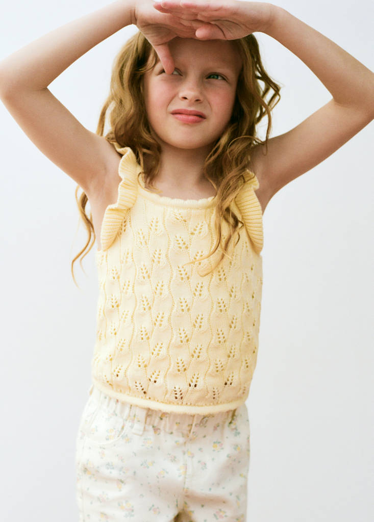 Öppen stickning. 100% Bomull. Rak design. Kort fåll. Axelband med volang