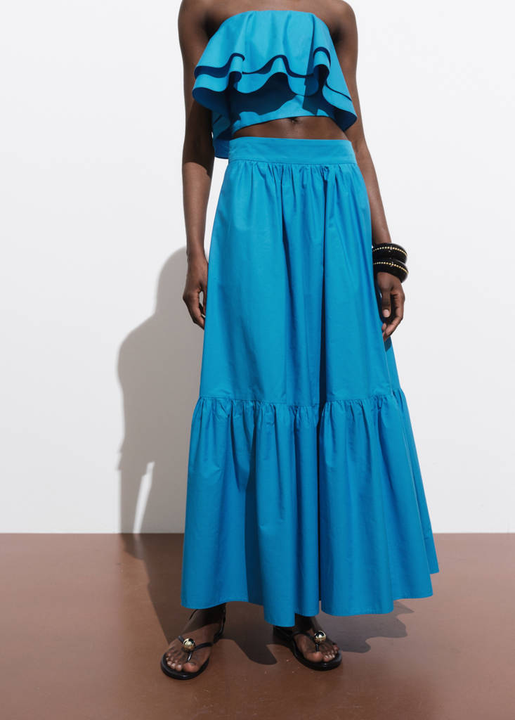 Denna kjol i 100% bomull har en lång och A-linjeformad design med hög midja. De rynkade detaljerna ger textur, medan den sidoplacerade dragkedjan säkerställer en bekväm passform. Den beige färgen finns exklusivt online