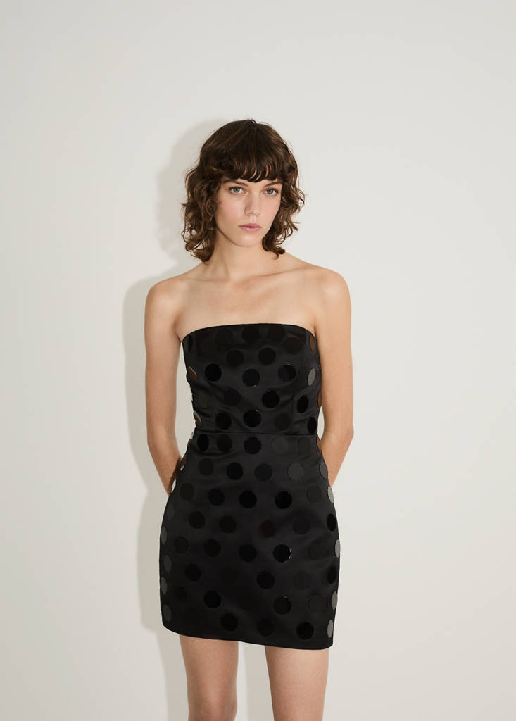 Vi har designat detta plagg som gör dig till festens mittpunkt. Dess design med speglar ton-i-ton och utan axelband får dig att glänsa på säsongens mest speciella evenemang. Satinväv. Italienskt tyg. Applikation med metalliska speglar. Figursydd design. Kort design. Bandeau. Ärmlös. Sidodragkedja. Innerfoder. Fest-, ceremoni- och kommunionskollektion. Artiklar ur CAPSULE-kollektion kan bytas eller returneras inom 14 dagar från försändelsedatumet. Detta plagg tillhör vår eventkollektion, designad för att göra dig till den perfekta gästen på vilken fest, bröllop eller ceremoni som helst