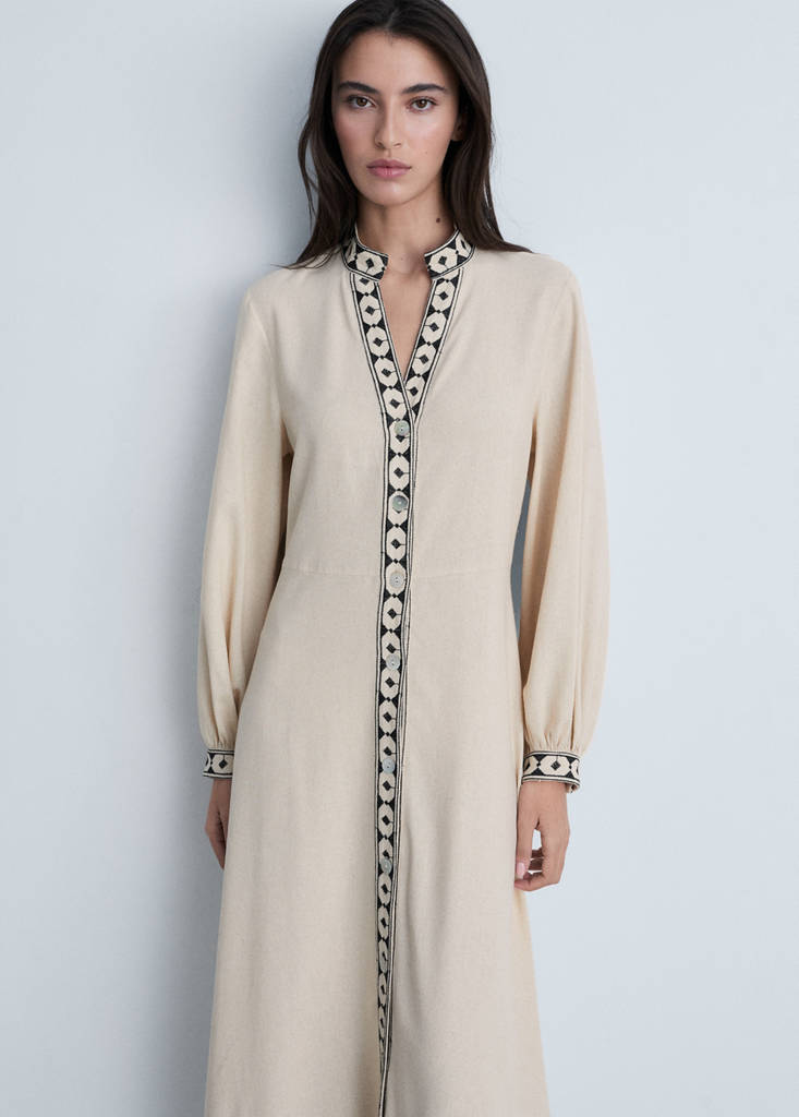 100% Bomull. Hålsöm detaljer. Kort design. Flared design. Rak ringning. Korta puffärmar. Resårdetaljer. Lätt tyg. Mididesign. Framstängning. Långärmad. A-linje design. Skjortkrage. Utan innerfoder. Ramadan-kollektion