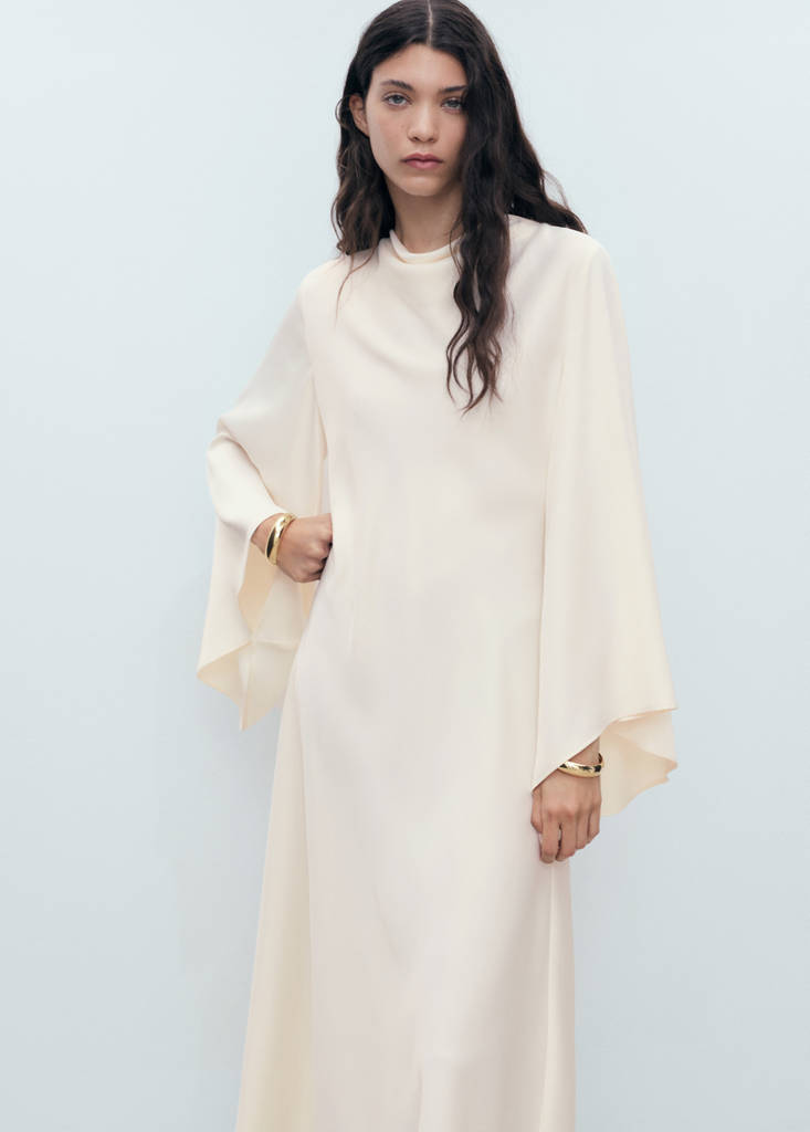 Satinväv. Lång design. A-linje design. Draperad krage. Lång ärm flared. Dragkedja bak. Detta plagg tillhör vår eventkollektion, designad för att göra dig till den perfekta gästen på vilken fest, bröllop eller ceremoni som helst. Flödande tyg med satinfinish. Ramadan-kollektion