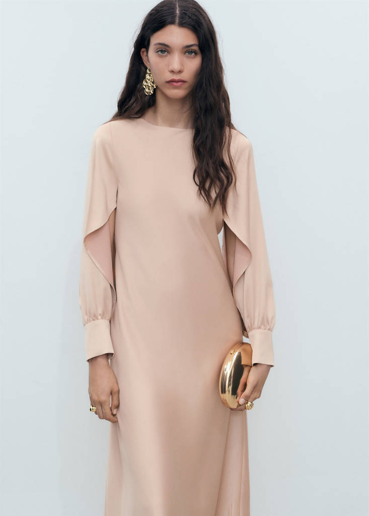 Flödande tyg med satinfinish. Rak design. Lång design. Rund halsringning. Långärmad med knäppta manschetter. Utskärning på ärmarna. Knappstängning på baksidan. Detta plagg tillhör vår eventkollektion, designad för att göra dig till den perfekta gästen på vilken fest, bröllop eller ceremoni som helst