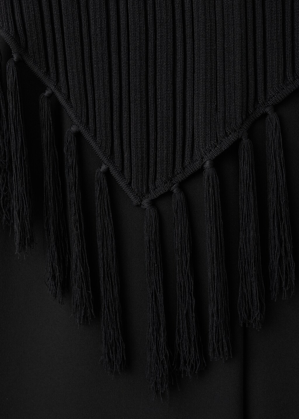 Tyg med struktur. Lång design. Kombinerad design. Perkins-krage. Ärmlös. Breda axelband. Fransdetaljer. Dragkedja bak. Innerfoder. Detta plagg tillhör vår fest- och eventkollektion, designad för att höja dina looks vid speciella tillfällen.
