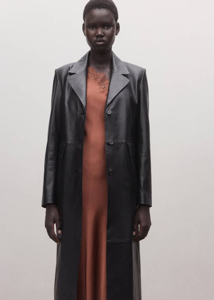 100% fårskinn. Rak design. Lång design. V-ringning med slag. Långärmad. Två påsydda sidofickor med lock. Bakre slits vid fållen. Framknäppning. Exklusivt online. Selection-kollektion