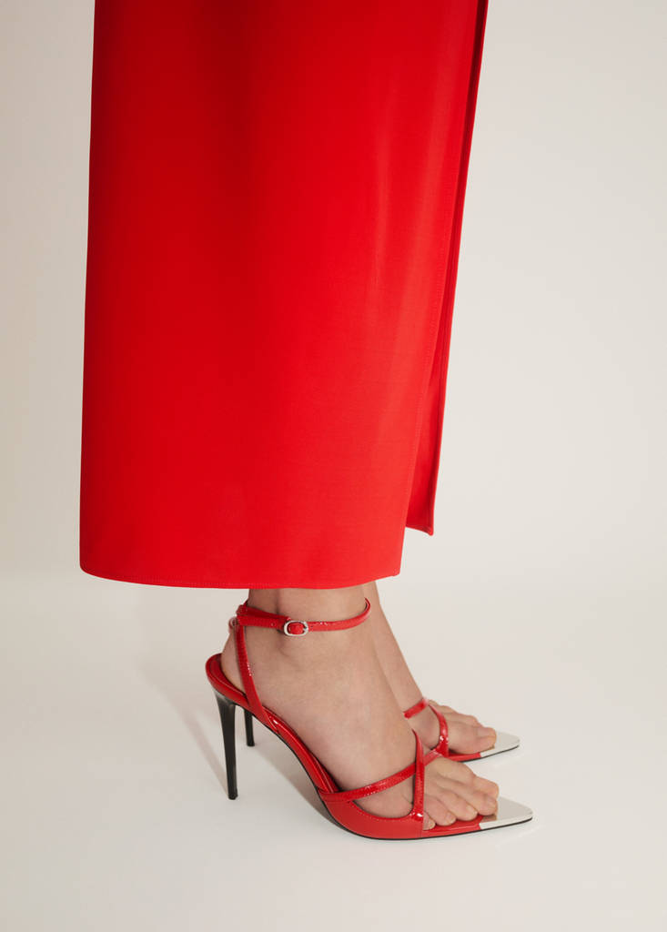 En sko i kombinerat skinn med metalliserad tå kompletterar din look med en modern, sofistikerad touch. Med dess omlottremmar och vristrem känner du dig säker och bekväm hela kvällen. 100% Läder. Spetsklack. Spänne stängning. Spetsig. Metallapplikation på tå. Vristband. Design med remmar. Klacken mäter 11 cm. Fest-, ceremoni- och kommunionskollektion. Artiklar ur CAPSULE-kollektion kan bytas eller returneras inom 14 dagar från försändelsedatumet