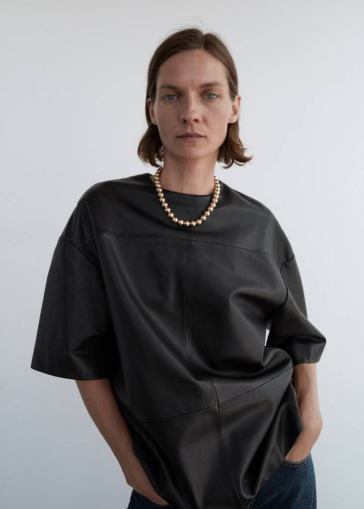 Denna t-shirt har tillverkats i 100 % fårskinn, har en oversize-design med rund hals och kort ärm. Den inkluderar dragkedja i ryggen och innerfoder. Selection-kollektionen