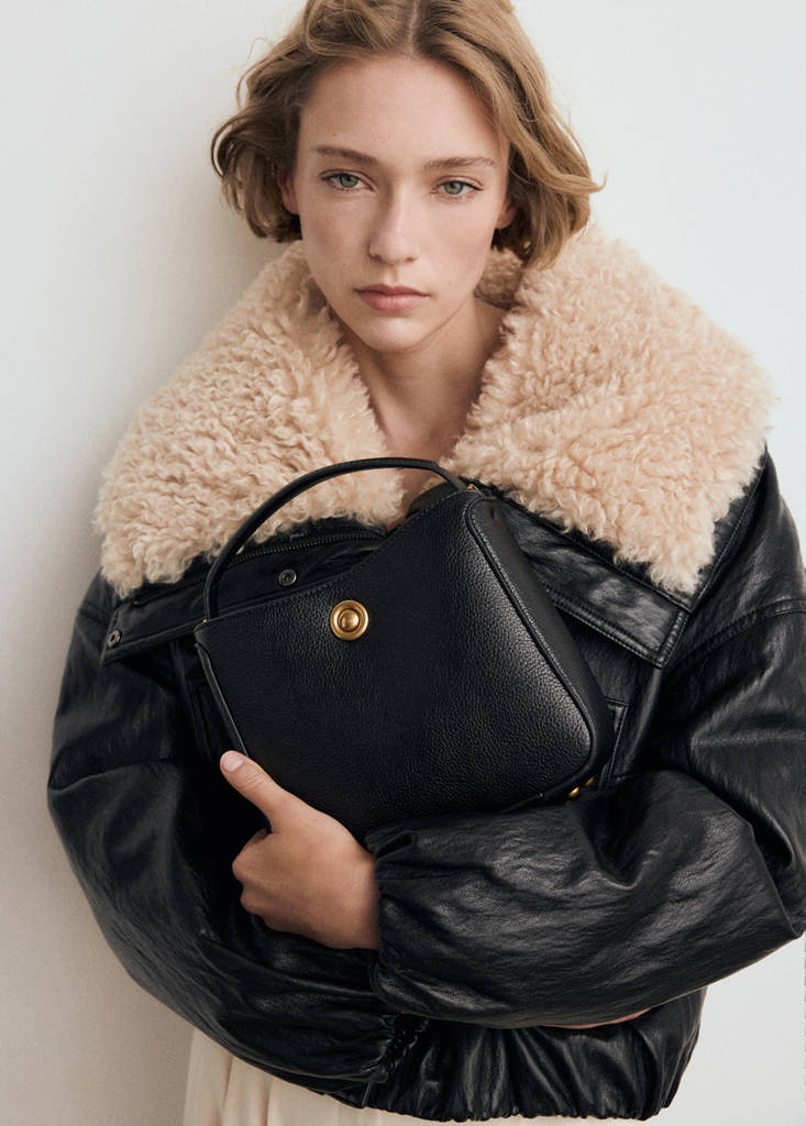Liten storlek. Bucketdesign. Kort handtag. Lång justerbar och löstagbar rem. Innerficka med blixtlås. Metallisk detalj. Tryckknapp stängning. Innerfoder