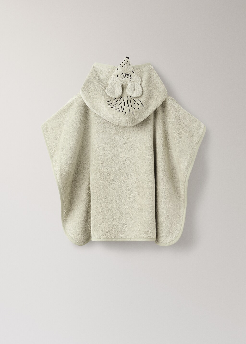 100% bomull. Storlek: 80 x 80 cm. Gramvikt: 400 g. Badcape för barn tillverkad i 100 % bomull med en gramvikt på 400 g/m², vilket garanterar en mjuk, absorberande och bekväm textur för barns känsliga hud. Designen inkluderar en integrerad huva med tredimensionella öron, vilket gör den till en funktionell och lekfull produkt, perfekt för att göra badet till en rolig och mysig upplevelse.