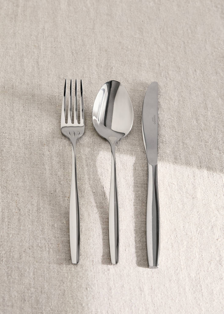 Bestickset 3 delar: sked, gaffel och kniv. 100% rostfritt stål. Sked: 21 cm. Gaffel: 21 cm. Kniv: 23 cm. Tunt handtag. Kombinera med fler produkter från kollektionen. Kan diskas i diskmaskin