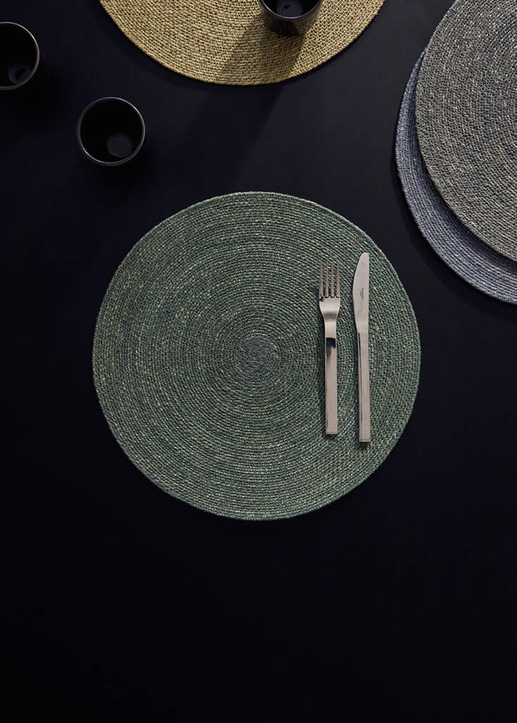 100% sjögräs. Diameter 38 cm. Set med 4 bordstabletter med matchande låda. Alla bordstabletter har olika färger. De presenteras i en låda gjord av samma material, som inte bara kompletterar designen på bordstabletterna, utan också erbjuder en praktisk lösning för att förvara dem när de inte används. Lådan är idealisk för att hålla dina bordstabletter organiserade och skyddade, och dess design i sjögräs ger en naturlig och sofistikerad touch till ditt utrymme. Lägg till en färgglad touch till ditt bord vid alla tillfällen