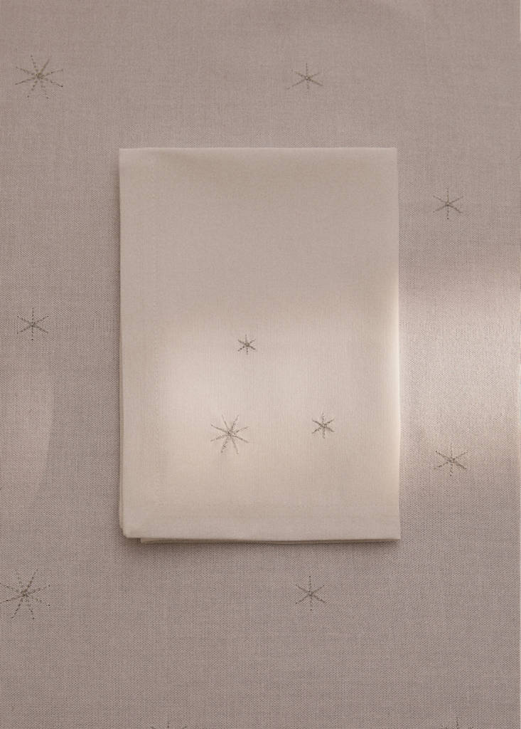 100% Bomull. Storlek: 45x45cm. Set med fyra servetter tillverkade av 100 % bomullstyg, vilket ger en mjuk, behaglig och hållbar textur. De passar både för dagligt bruk och för speciella tillfällen. Den broderade detaljen med stjärnor i de nedre hörnen skapar en subtil och harmonisk kontrast till designen, vilket ger en sofistikerad känsla till alla måltider. Kombinera med fler artiklar