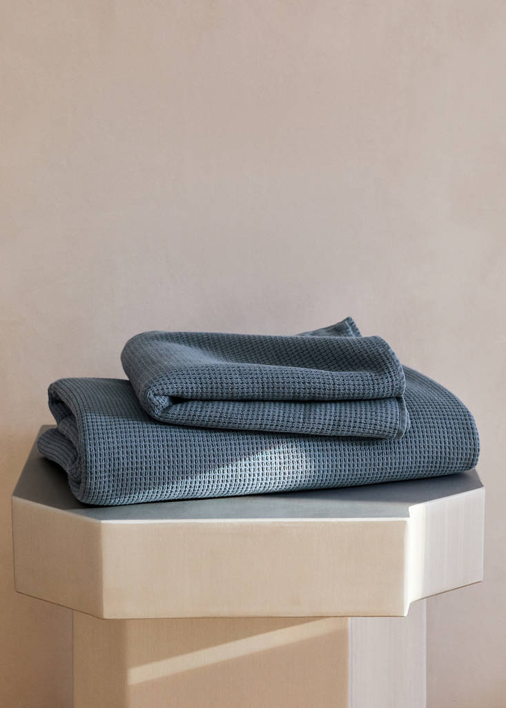 Handduk. Storlek: 50x90 cm. 100% bomullstyg. Vikt: 650 gr/m2. Randigt design. Behaglig textur. Dubbel handduk med waffle-design på ena sidan för ett modernt utseende, och frotté på den andra för effektiv absorption och snabb torkning. Dess eleganta design kommer att ge ditt badrum en sofistikerad touch. Den är lätt, kompakt och torkar snabbt, perfekt för alla tillfällen. Matchar med fler artiklar från kollektionen
