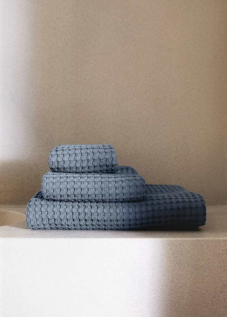 100% Bomull. Vikt: 400 g/m2. Storlek: 50x90 cm. Våfflad textur. Svalt, mjukt, hållbart, andningsbart och mångsidigt tyg. Upplev komforten, texturen och den utmärkta absorptionsförmåga hos denna handduk. Dess eleganta design kommer att ge ditt badrum en sofistikerad touch. Finns i olika färger. Kombinera med fler produkter från kollektionen