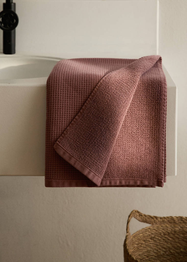 Handduk. Storlek: 50x90 cm. 100% bomullstyg. Vikt: 650 gr/m2. Randigt mönster. Behaglig textur. Dubbel handduk med waffle-design på ena sidan för ett modernt utseende, och frotté på den andra för effektiv absorption och snabb torkning. Dess eleganta design kommer att ge ditt badrum en sofistikerad touch. Den är lätt, kompakt och torkar snabbt, perfekt för alla tillfällen. Matchar med fler artiklar från kollektionen
