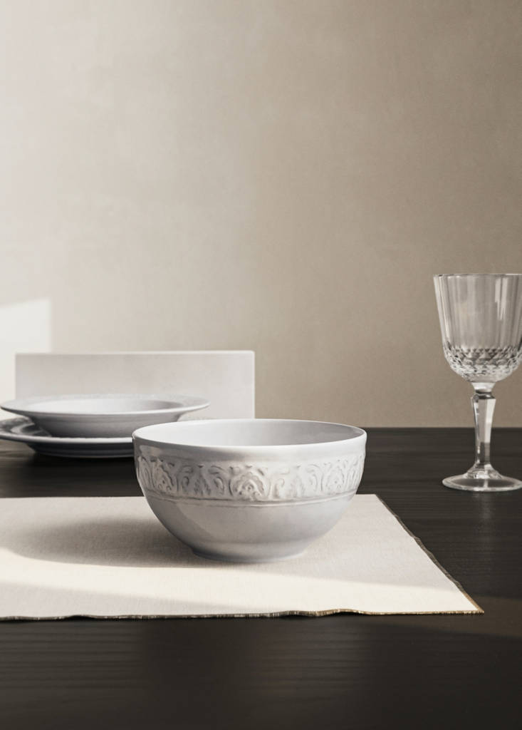 100% stengods. Skål tillverkad i stengods. Diameter: 14 cm. Storlek: 14 x 6,5 cm. Bård textur kontrast. Kan fyllas med vätska. Kan fyllas med vatten. Matlåda. Vår utsökta skål i stengods blir ett rustikt inslag i ditt hem och är perfekt för att servera tilltugg vid alla tillfällen. Den är hantverksmässigt tillverkad och dess emaljering med diskret textur blir ett sofistikerat inslag i din dukning. Kan användas i mikrovågsugn. Kan diskas i diskmaskin