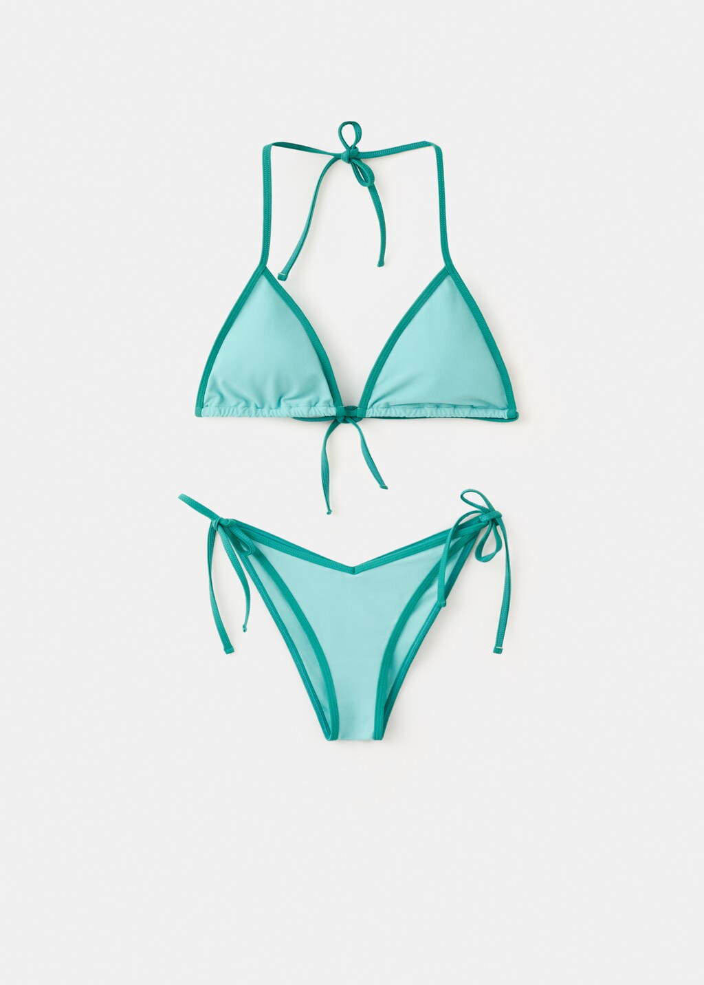 Bikiniset. Elastiskt tyg. Triangelsiluett. Tvåfärgad design. Slingstängning i nacken. Detalj med justerbara rosetter. Justerbart band i midjan. Brasiliansk bikinitrosa. Badkollektion.