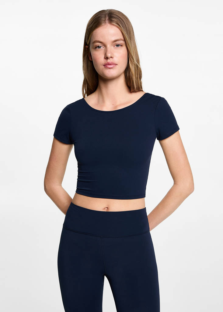 Slim fit. Rak design. Cropdesign. Rund halsringning. Kort ärm. Modellbild genererad med hjälp av artificiell intelligens