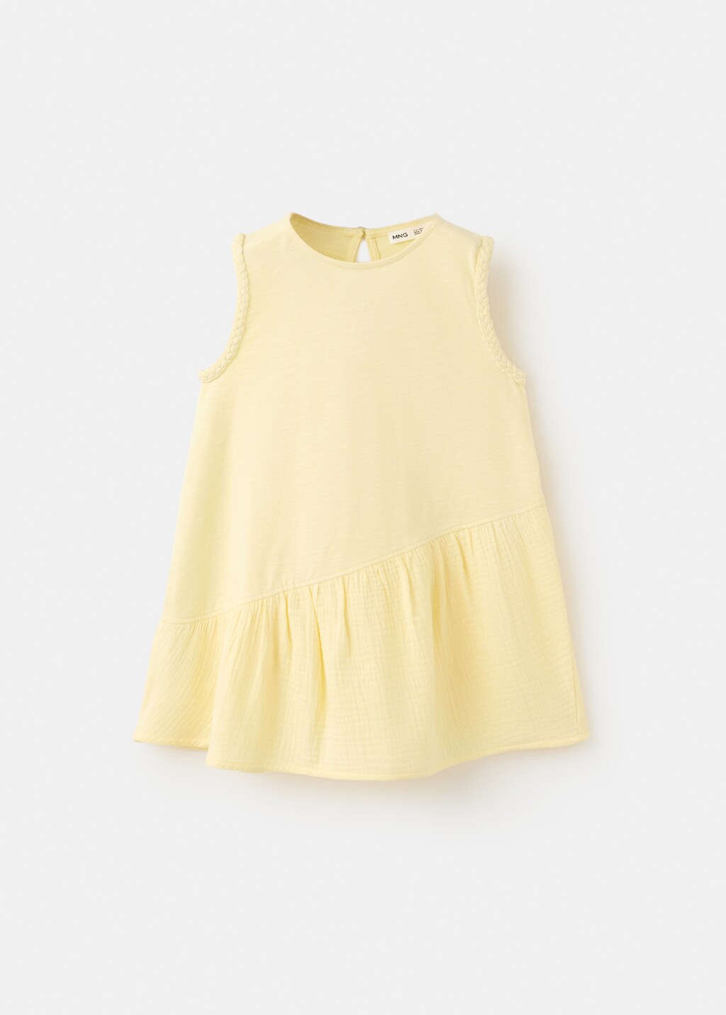 New NowDress with plaited detailsCurrent price [€ 19,99 ]€ 19,99Select a colourPastel YellowSelect your size12-18 months (86cm)Not available. I want it!18-24 months (92cm)Not available. I want it!2-3 years (98cm)Not available. I want it!3-4 years (104cm)Not available. I want it!4-5 years (110cm)Not available. I want it!5-6 years (116cm)Not available. I want it!DimensionsNotify meAdd to WishlistSee lookFree delivery to store100% cotton fabric. Straight design. Short design. Round neck. Sleeveless. Teardrop fastening at back. Braided detailsDetails, composition and careStore availabilityItem qualitiesRecycled cottonAt least 20%This fibre is obtained from pre- and post-consumer textile waste that is transformed into new fabrics.