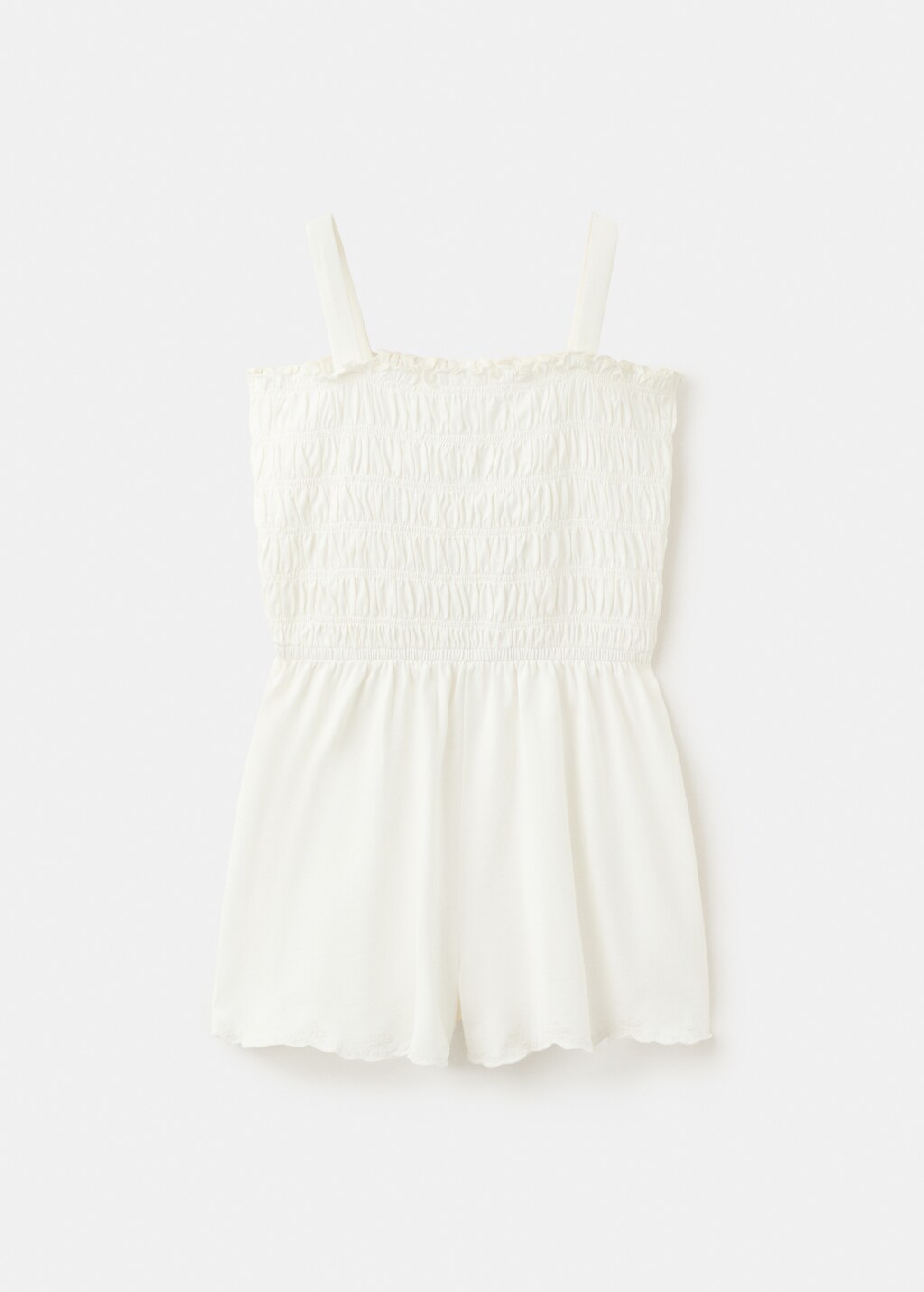 100% cotton fabric. Short design. Straight collar. Gathered panel at the waist. Thin straps