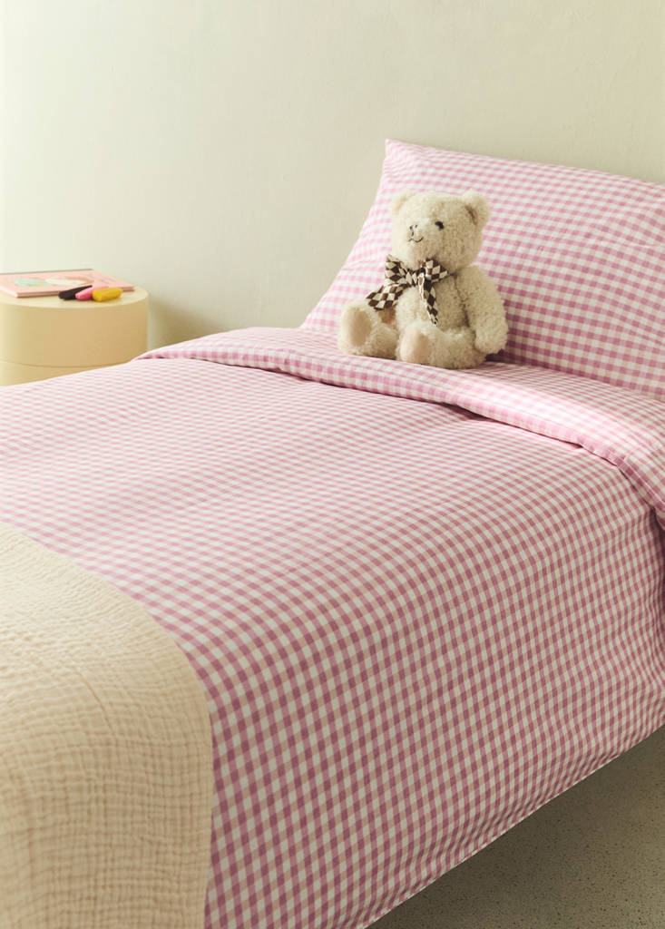 MADE IN SPAINVichy check cotton duvet cover 90 cm Single bedCurrent price [€ 49,99 ]€ 49,99Select a colourPinkSelect your sizeSingle (150x220cm)AddAdd to your wishlistSee lookFree delivery to store100% Cotton. Size: 150x220cm. Vichy check pattern. 90cm Bed. 200 thread count. Coordinate with more matching products from the collectionDetails, composition and careStore availability