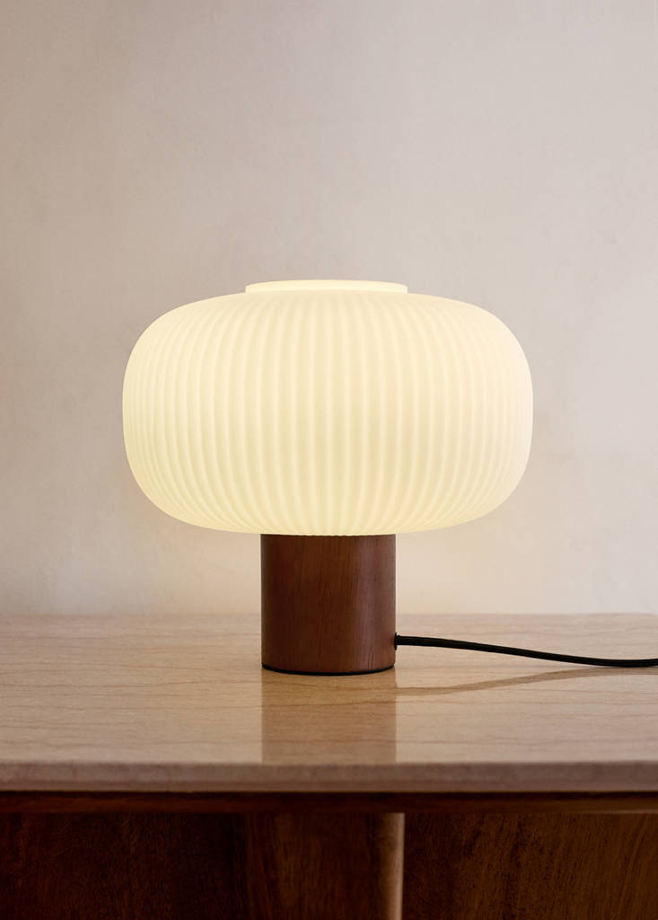50% wood. 50% glass. Table lamp with wooden base and organically-shaped glass shade. Ideal for any room in the home, the puffed shape of the lampshade adds a subtle touch of design and originality. Plug-in. Bulb not included. Operates with a 250V 4A bulb