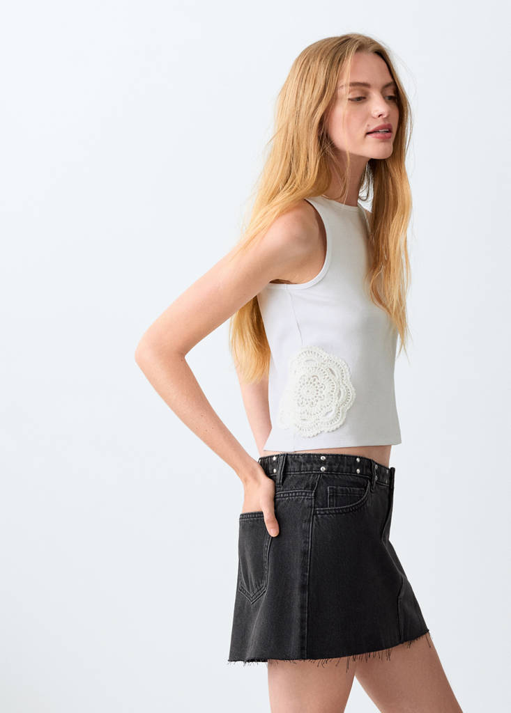 Cotton fabric. Fitted design. Round neck. Sleeveless. Embroidered flower detail