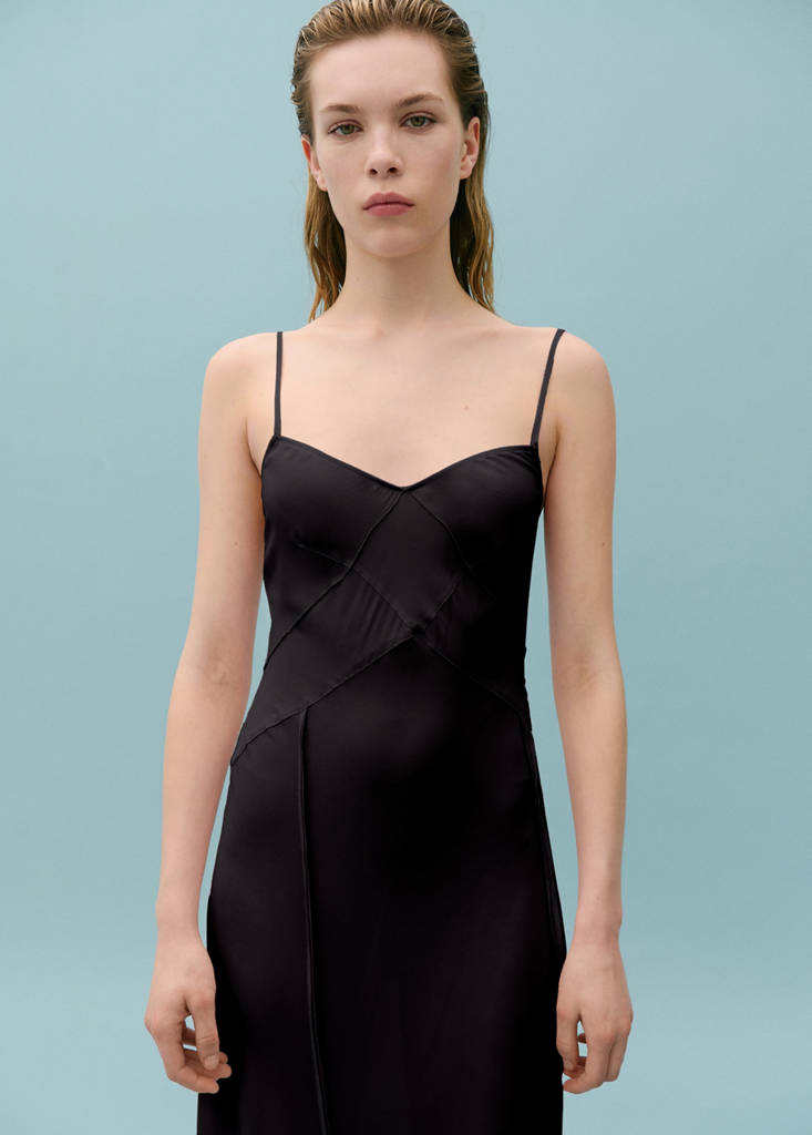 Fluid fabric. Semi-transparent fabric. Long design. A-line design. V-neckline. Sleeveless. Thin straps. No Fastening. Decorative seams. Godet detail. Without inner lining. Fitted design
