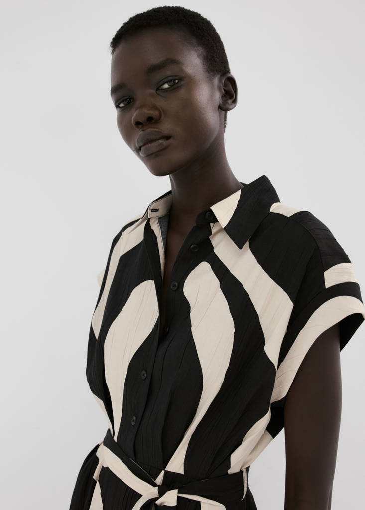 Crinkled effect fabric. A-line design. Long design. Shirt collar. Sleeveless. Front closure with buttons. Adjustable belt. Without inner lining. Available Plus