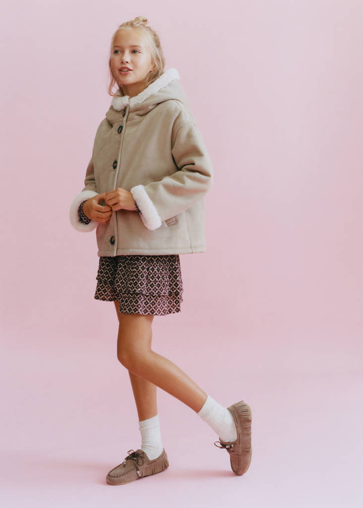 Suede-effect fabric. Fur-effect lining. Straight design. Medium design. With hood. Long sleeves. Faux fur cuffs. Front closure with buttons. Two side pockets. Christmas Collection