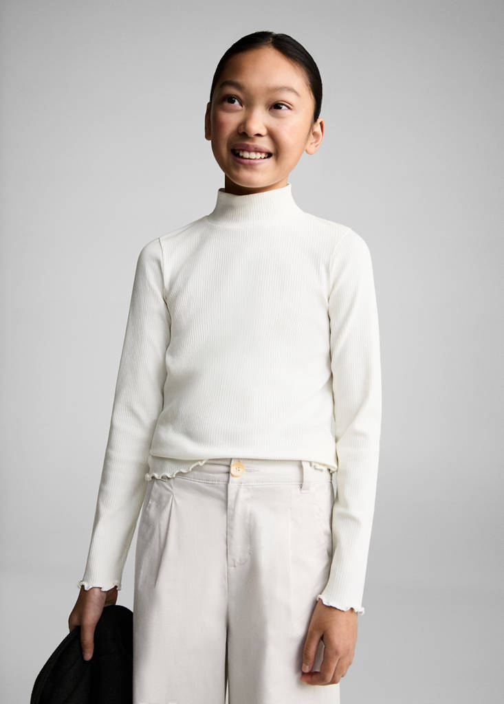 Ribbed high neck t-shirtCurrent price [€ 12,99 ]€ 12,99Select a colourOff WhiteSelect your size5-6 years (116cm)Not available. I want it!7-8 years (128cm)Not available. I want it!9-10 years (140cm)Not available. I want it!11-12 years (152cm)Not available. I want it!13-14 years (164cm)Not available. I want it!DimensionsNotify meAdd to WishlistSee lookFree delivery to storeRibbed design. Straight design. Slim fit. Long sleeves. Fabric with cotton. High neckDetails, composition and careStore availabilityItem qualitiesRecycled cottonAt least 20%This fibre is obtained from pre- and post-consumer textile waste that is transformed into new fabrics.