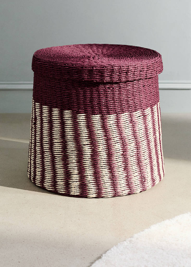 Striped paper basket with medium-sized lidCurrent price [€ 55,99 ]€ 55,99Select a colourDark OrangeSelect your sizeMNot available. I want it!Notify meAdd to WishlistSee lookFree delivery to store100% paper. With lid. Diameter: 38.5cm. Height: 35cm. Perfect for storage or as a decorative piece. Available in two sizesDetails, composition and careStore availability
