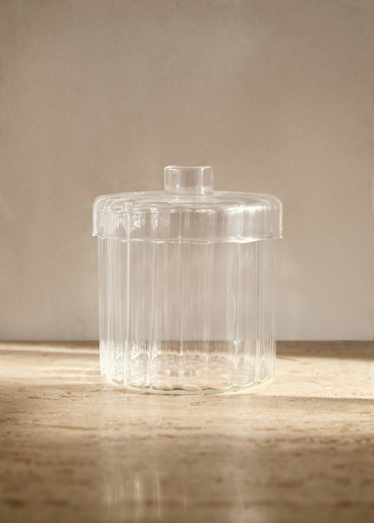 Bathroom decor box. 100% borosilicate glass. Size: 15x8.5 cm. With lid. Creates a warm and pleasant atmosphere. Combines functionality and elegance. Crafted from high-quality borosilicate glass, this accessory not only promises resistance to thermal changes, but also offers a delicate and minimalist aesthetic that complements the decor of any modern or contemporary bathroom. Vertical line design running across its surface, adding texture and a play of shadows and light. The matching lid ensures efficient coverage, protecting the contents from dust and moisture. Coordinates with more products from the collection